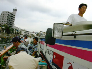 いつもの時間に船宿に到着すると、何だか様子が違います。船上は既に四隅はもちろん10席以上が埋まっています。来週9月10日に大会があるので、最近来られていない方々がリハーサルに押し寄せたのかもしれません。予想だにしなかった最盛期のような雰囲気に戸惑ってしまいます。とりあえず右の胴の間に荷物を下ろし、受付けを済ますと、私も早速アサリを剥き始めます。昨日、右手の人指し指を捻挫してしまい、大量に剥けそうにないので、今日は剥き身も購入しました。