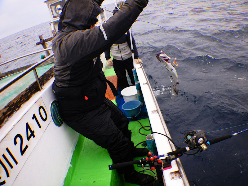 上がったのは小振りのタチウオ。アタリ出ずに餌盗るヤツが居ると思ったら正体はコレかぁ。90cmくらいあるとウレシイけどこれじゃちょっとねぇ。まぁキープ。PE噛まれないだけいいんですが、コレが居るのはけっこう怖いっす。12時20分、12時55分と周り直しますが、左舷トモで本命出たのかな?見えないので雰囲気だけ。こちら1流し目以来、本命っぽいアタリゼロで完全にヤバいパターン。基本魚っ気ゼロ。めぼしいところでは左舷胴の間さんかな?クロムツが上がってました。型は35cm級のまずまずサイズ。このくらいあると太さもあっていいおおかずになりますよね。お昼からやっと陽が出てきて若干楽に。でも今だ指がまともに動かず。