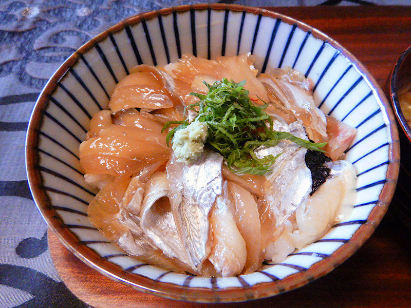 タチウオのヅケ丼。翌朝です。小振り1本薄く切って強引にヅケ丼一人前採りました。色がいつもより薄めに見えますが、色が入り過ぎちゃうのを考慮して薄口醤油で漬けたそうです。なので見た目よりはしっかり味が着いてます。タチウオは小振りとはいえ、翌朝なので歯応えコリコリで脂も乗ってて旨かったっす。