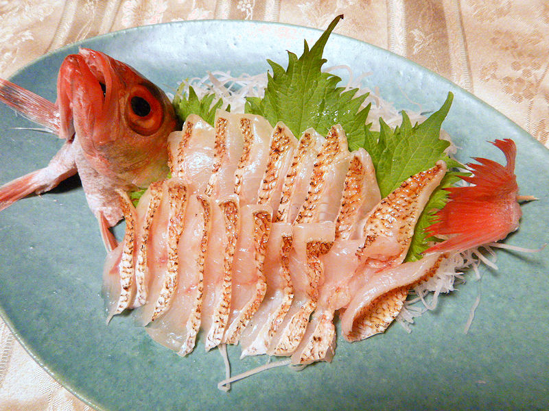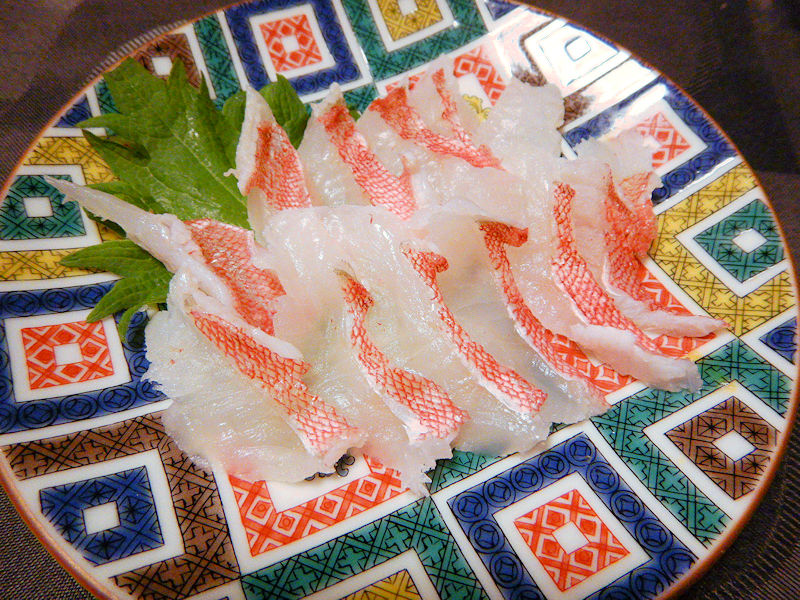 アカムツのお造り。毎度のことですが尾頭付きで炙り刺身を造りました。コレが毎度と言えるだけいい方ですよ。何故か一日アタリ1回で釣果1尾という日が多く、魚運があるのかないのか!?しかし、実際問題、大昔なら別ですが、今の時代に東京湾のアカムツ釣りで型見られる回数の方が多いというのは自分でもけっこうスゴイかも!?と思ったりして。型はともかく一応は食えるサイズが釣れますからねぇ。1尾だけだとやっぱ炙り刺身になってしまいます。コレは万人が旨いというでしょう。3日ほど寝かすと脂の乗り具合、ネットリした歯応え、炙りの香ばしさが三位一体となり極上品としか言いようがない。コレ1尾釣れると釣れないでは大違いなんですが、激渋の中、ナントか型だけは見られている昨今です。コレが経験値で上達した証なのかどうかはまだまだ自分でも判り兼ねますけど、何度もやらないと釣れないし、上手くもならないですからねぇ。そのうちいい日にも当たりたいものです。