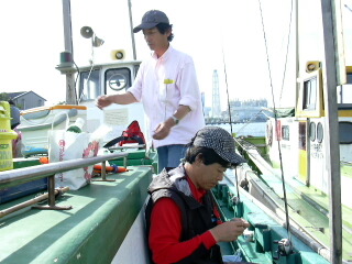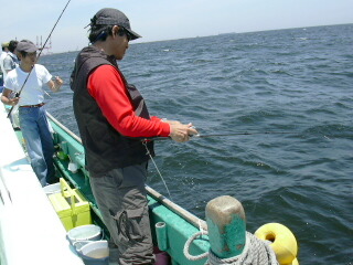 型は15、6cm級が主体でたまに20cmオーバーが混ざる程度である。良型は太さもあって引きが強く、船下に突っ込んでいくヤツも居るからハラハラさせられる。OKAZUさんも良型をヒットさせ、「この引きを楽しみに来たんだから!」とご満悦だ。KOBIさんもポツポツ上がるものの、今ひとつパターンに嵌れない様子である。朝の2流しは約1時間20分で32尾。このままペースが落ちなければ束行くんだけどな〜。でも後半は潮が変って艫流しになりそうだし、うまく拾えればいいけど、そう甘くないかな?風は依然強いが若干緩んだり強まったりを繰り返しながら安定している。風があるので気温が高い割りには凌ぎ易く、飲み物も不足することは無さそうだ。