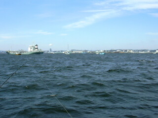 周りを見回すと、今日は仕立船が2杯、ビシアジ船が男女4人グループだけの乗船。我々シロギス船は左右6名づつの12名となった。乗船札と引き換えに青イソメを受け取り、いつものように頭のカットを済ませる。船着場でもけっこう風を感じるので、沖は相当吹いてるかもしれない。根岸丸では最近富岡沖を中心に攻めているようだし、南〜南西だからかなり強く吹いても大丈夫だろう。準備が整い、定刻少し前の7時55分、貞末船長の操舵により出船となった。強風で航行中は波を被るので荷物を持ってキャビンに避難である。航程約10分、根岸湾を出て富岡堤防の真沖に出たところでエンジンスローとなり、8時10分、早速開始のアナウンスが出た。