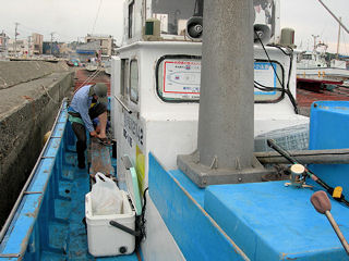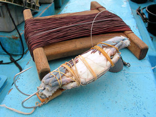 貸し道具・・・渋糸に40号のテンヤ、餌は冷凍のワタリガニ/新兵衛丸で出船。