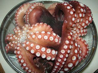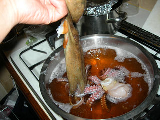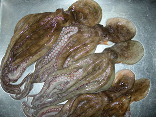 内臓を取り除き、塩もみしてヌメリを取った状態/足先から順に熱湯へ・・・茹で過ぎに注意。