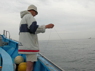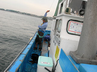 しかし、竿もリールも仕掛けも持たずに釣りに行くってのは忘れ物だらけのようで妙な気分。4時、OKAZUさんが迎えに来てくださり、行程40分ほどで港に到着したが、店はまだ開いていなかった。先に場所だけ取っちゃいましょうか!と言っても船がどれだか分からない。5時になって店が開くと、マダコは新兵衛丸というチャーター船で出ますと女将さん。違う船で場所取らなくてよかった。堤防に新兵衛丸を見つけると早速乗船。潮向き読めないし、とりあえず右舷ミヨシにOKAZUさん、胴の間に私が並び、トモにもう1名が乗って右舷は3名、左舷には2名入って合計5名の乗客。船は小さいが、この人数なら余裕のスペース、これで釣れれば言うこと無しだが・・・。木枠に巻かれた渋糸とテンヤを船長からお借りした。テンヤはオモリ40号でワタリガニが装着されたまま冷凍されている。渋糸の先にナイロン20号ほどの先糸が1ヒロくらい繋いであり、その先端のスナップサルカンとテンヤを接続するだけ。後は仕掛けを海底に下ろし、小突いてタコが乗ったら合わせて手繰り込めば一丁上がり?口で言ってしまえば簡単なのだが、毎週タコ釣りに通うマニアも居らっしゃるほどだから、やはりどんな釣りも極めようとすれば奥が深いのだろう。何故か私は昔からタコ用の網袋を持っていたので一応持参してみたが、船に常備されていないので正解だった。さて、準備も整い5時55分、出船である。