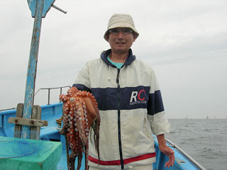 11時を回ると雨がポツポツ、予報より降り始めが早いな・・・。左舷ミヨシで1杯出た後、私も乗りが続いて短時間で3打数2安打と好調。本日ラストチャンスにOKAZUさんが酷い根掛かり。この時合に付いてないね!またまたテンヤお買い上げ?ミシミシとワカメの株でも引っ掛けたらしい。船長の指示で引っ張ったり急に緩めたりを繰り返すと、ちょっとした拍子に外れたが、手繰り上げる手が何だか重たそう。ご本人、頭の中はワカメの株?それタコじゃないの?先糸を掴むと海面近くにボワーッと赤い物体が・・・やっぱタコだ!デカイ!一気に抜き上げたのは後の計量で2.5Kgの船中最大。やったね!根掛かり三振が逆転ホームランへ。すると手繰った渋糸の上をタコが這いずり回ってしまい重度のオマツリ。解くのに20分も掛かってましたが、この型が釣れればもういいですもんね!終了間際、私はもう1杯追加して、これが本日自己最大の580g。そのまま沖上がりの12時を迎えて終了。結果、右舷ミヨシ(OKAZUさん)2杯、胴の間(私)5杯、トモ7杯。左舷ミヨシ4杯、トモ1杯、船中5名で19杯。ここ数日の平均からすれば低調だったけど、それなりに数出るからやはり当たり年なのだろう。釣り味的にはもうちょっと良型(せめてキロオーバー)を乗せたかったけど、おかず的には十分過ぎ。小突く指をジンワリ押さえ込まれ重みが増す・・・乗ったか?勝負ッ!ウリャーって合わせると十中八九がワカメの束。でも乗ったときの重量感と水面下に赤い物体が浮上したときの喜びは何とも言えず・・・船タコ初体験は斯くなる結果と相成りました。