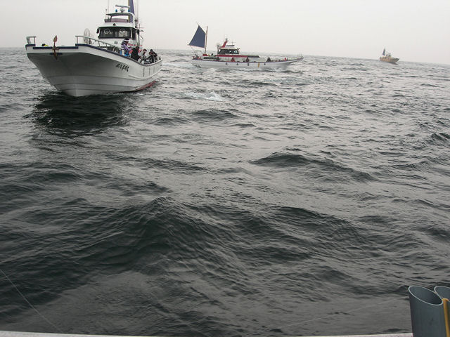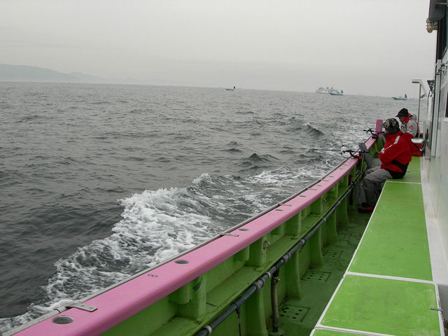 抹茶ウィリー、Y社のチビエビ5(ブルー)&チビイカ5(赤白系)の組み合わせ。オモリは規定の50号(トップガン)を接続。ちなみに道具は『極鋭ゲーム・テク160』(自分で20cm詰めた)&『エアドレッドチューン』にPE1号〜リーダー5号約1m。その後、お客さんあまり増えずに右舷3名、左舷は2名+船長の道具という態勢で少し早めの7時5分頃に出船。久里浜沖まで20分くらい走るとのアナウンス。さ〜て2年ぶりのマルイカ釣り、どうかなぁ・・・。