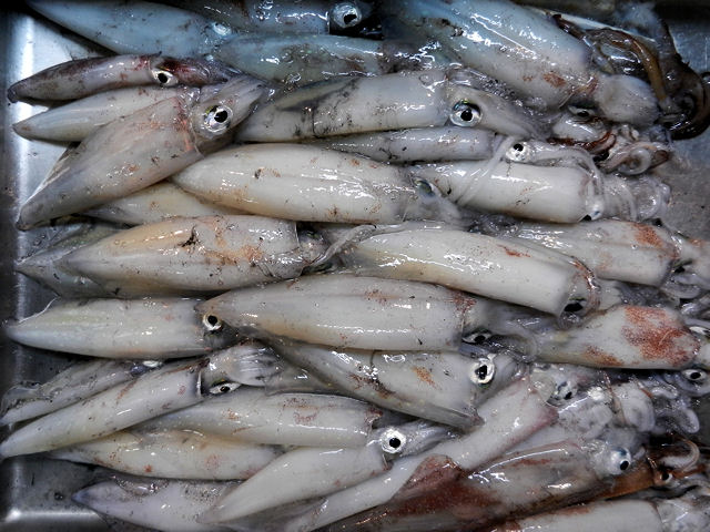 下げ潮がトロ〜ッと動き始め、雨もパラつくような空模様も奏功してか、12時少し前辺りから更に乗り目が上がって来て、お腹空いて堪んないのに飯食う暇も無い。仕掛け回収後、おにぎり半分食べた頃、もしくは仕掛けに着いた墨を掃除し終える頃には投入の合図となる。相変わらずバレちゃうのも多いが、上手く行ってトリプルが2回、ダブルも数回あって一気に数が伸びる。こちらに来てから8割が着乗りで、着乗りしなければ1、2回誘って乗るか、一旦10m以上巻き上げての落とし直し(巻き落とし)での着乗りがほとんど。数が着くのは最初の着乗りでその後は乗っても単発が多いのはイカ釣り共通のこと。自分が着底で空振りしてもお隣さんに乗りがあれば、しつこく一箇所で誘い続けず、すぐに巻き落としで仕掛けの落下位置をリフレッシュしてやると2回目で難無く乗って来ることも多い。仕掛けを叩いたり細かい操作はまったく効果が見られず、イカがスレてないので、スッテの配色さえ間違っていなければ、後はイカの視界に上手く仕掛けが入るかどうかが勝負と言って良さそうだ。そういう意味ではスルメイカ釣り的なイメージかもしれない。今日は5cmのシンキングタイプのスッテを使用しているが、もしかするとこれによって群れの中の小さい方のイカを釣っている可能性もあり、大型を上げられているお客さんも居られるようなので、船長も仰っていたが、7cmのブランコ仕掛けでシャクったら大型がガンガン乗って来たり?なんて可能性も無くもない。さて、先ほど久里浜沖で操業していた船も5、6隻ほどこちらに移動してきて、13時過ぎまでの1時間くらいの間、船団も入れ替わり立ち代りのゴールデンタイム。僚船でイカが取り込まれる場面も多く見られ、みなさん、久し振りのマルイカの手応えを堪能されているに違い無い。この時季にこんな良い釣りできると思っていなかったので小さいクーラー持って来てしまったが、こんなに釣れて帰りに蓋が閉まるかだんだん心配になってきた。13時台になるとだいぶ落ち着き加減となってきて、逆にホッとするくらいである。この時間、旋回時間はだいぶ長めになってきたが反応は未だに見られ、上手く入れば1杯づつポツポツ拾える状況が続いていたが、さすがに終盤は乗り目が落ちてしまい、最後の2投はアタリ出せずで15時少し前までやって終了。結果、久里浜沖で6杯の後、剣崎沖で37杯確保して全部込み込みの43杯。アタリや乗りはいったい何倍あったことやら!?まだシーズン始まったばかり、今年はイケそうな感じかな?