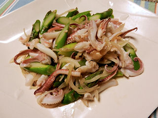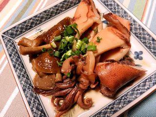 マルイカのゲソとアスパラ、タマネギの炒め物、マルイカと大なめこの煮物。マルイカはどうにでも使えるから消費に困りません。ゲソは一旦、全部軽く湯がいてしまい、タッパーなどで保存すれば日持ちしますし、そのまま小出しにつまんでも良し、炒め物など他の料理に転用してもまた良し。